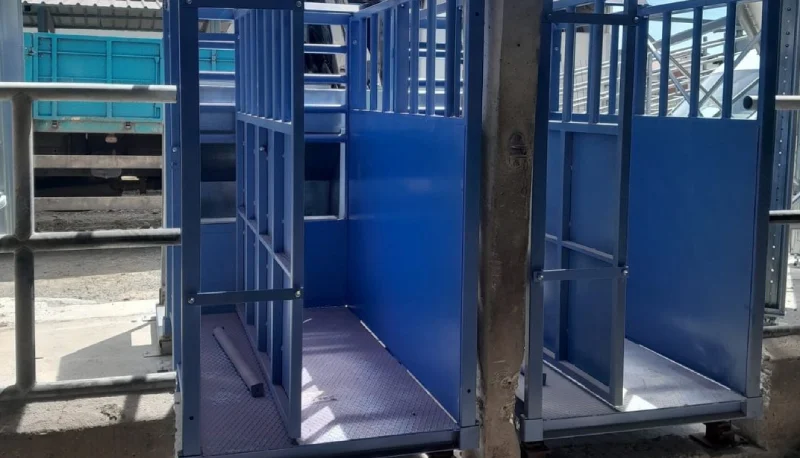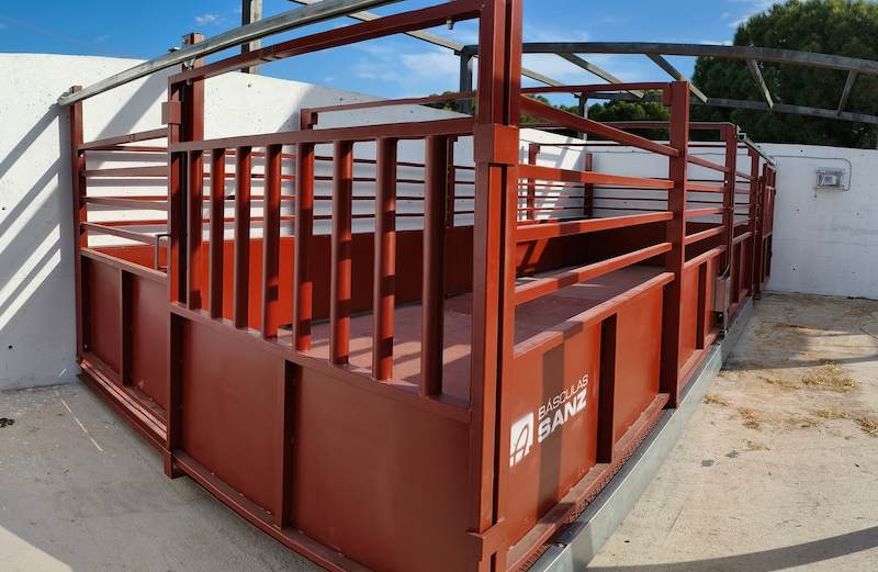 Se trata de una báscula de 8×3 metros, con capacidad de hasta 15.000 kg. Está diseñada como una estructura desmontable, lo que permite su carga, descarga y posterior montaje en el lugar de destino. Además, cuenta con plataforma y paredes metálicas a modo de jaula, lo que facilita el manejo de los animales con mayor seguridad.
